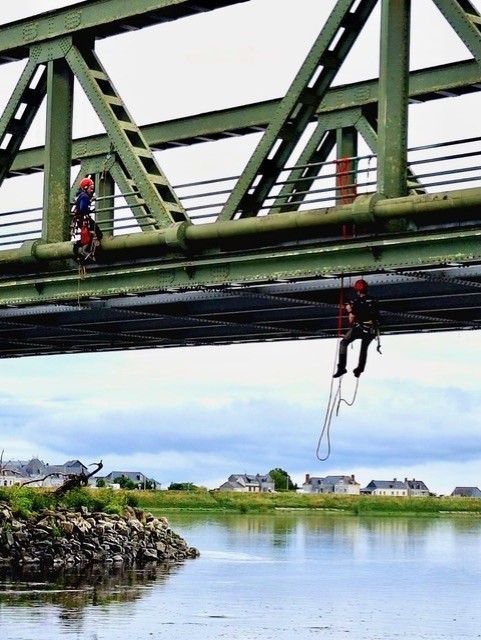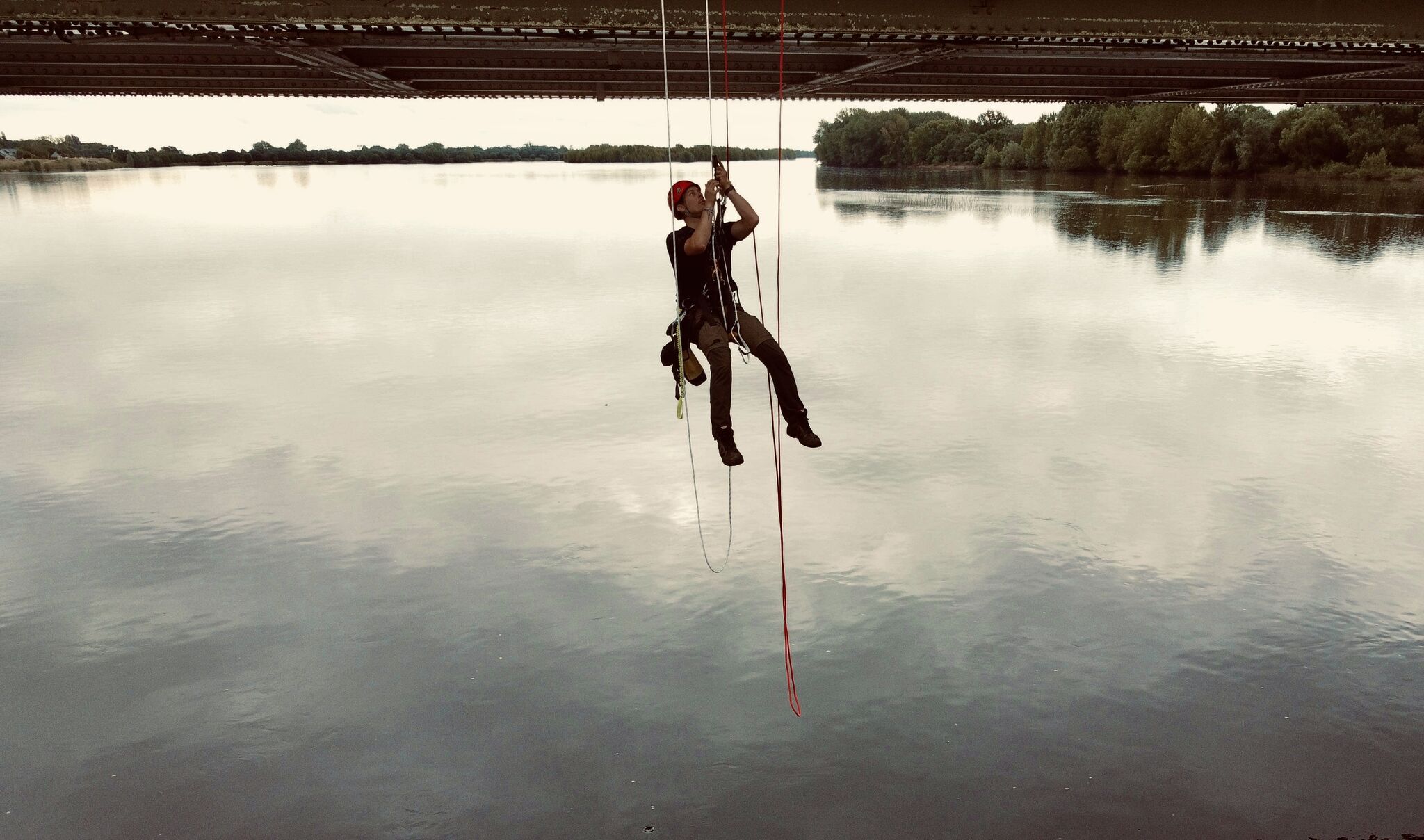 Pendant deux semaines, nos électriciens cordistes ont œuvré à 10 mètres au-dessus de la Loire, en suspension au-dessus de l’eau. Leur mission ? Démonter 65 luminaires (des spots d’éclairage public assurant un éclairage indirect du pont) ainsi que l’ensemble du câblage, le tout en co-activité avec l’entreprise de sablage présente sur le site.